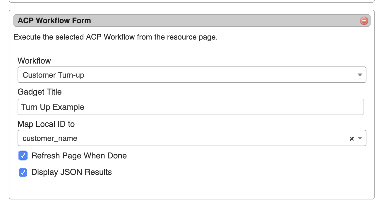 Once ACP settings have been added to Admin Preferences, the "ACP Workflow Form" Gadget can be added to a Section, and Workflows from the associated ACP instance will be available to select. containing fields to select the desired Workflow to Run, Title, and map input options.