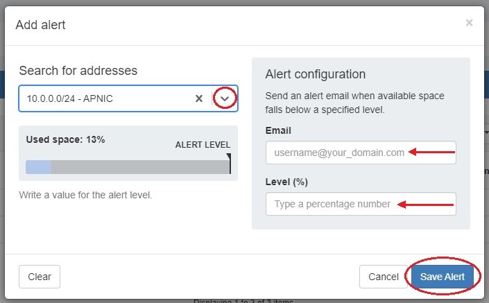 Users can set IPAM alerts from the Alerts Management page as well as view alerts set from IPAM Manage Aggregate.