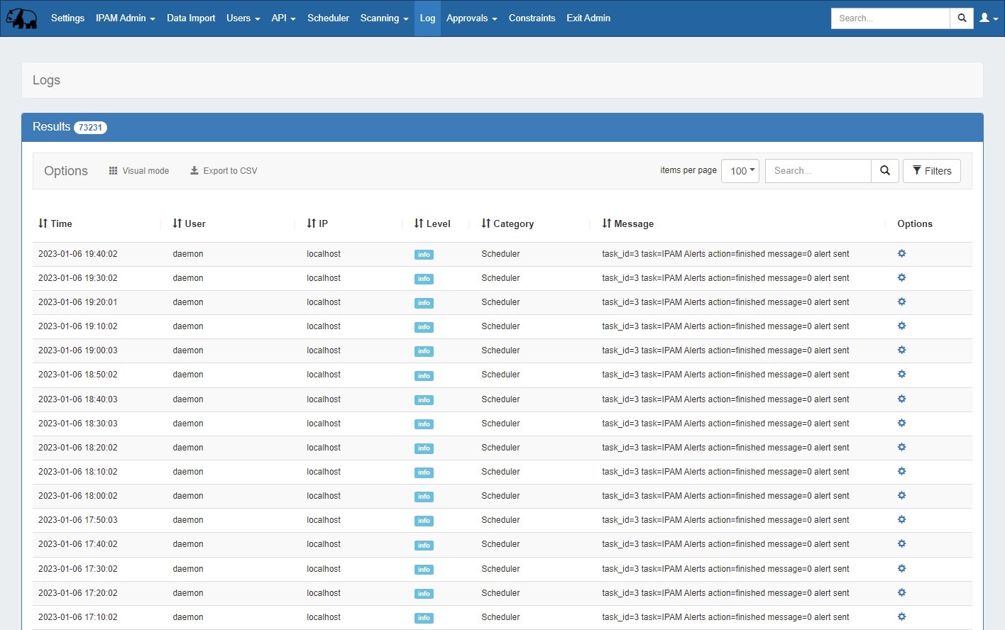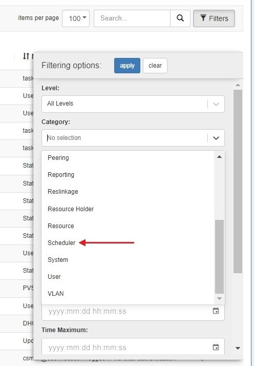 The "Scheduler" category allows filtering of automated cron tasks.
