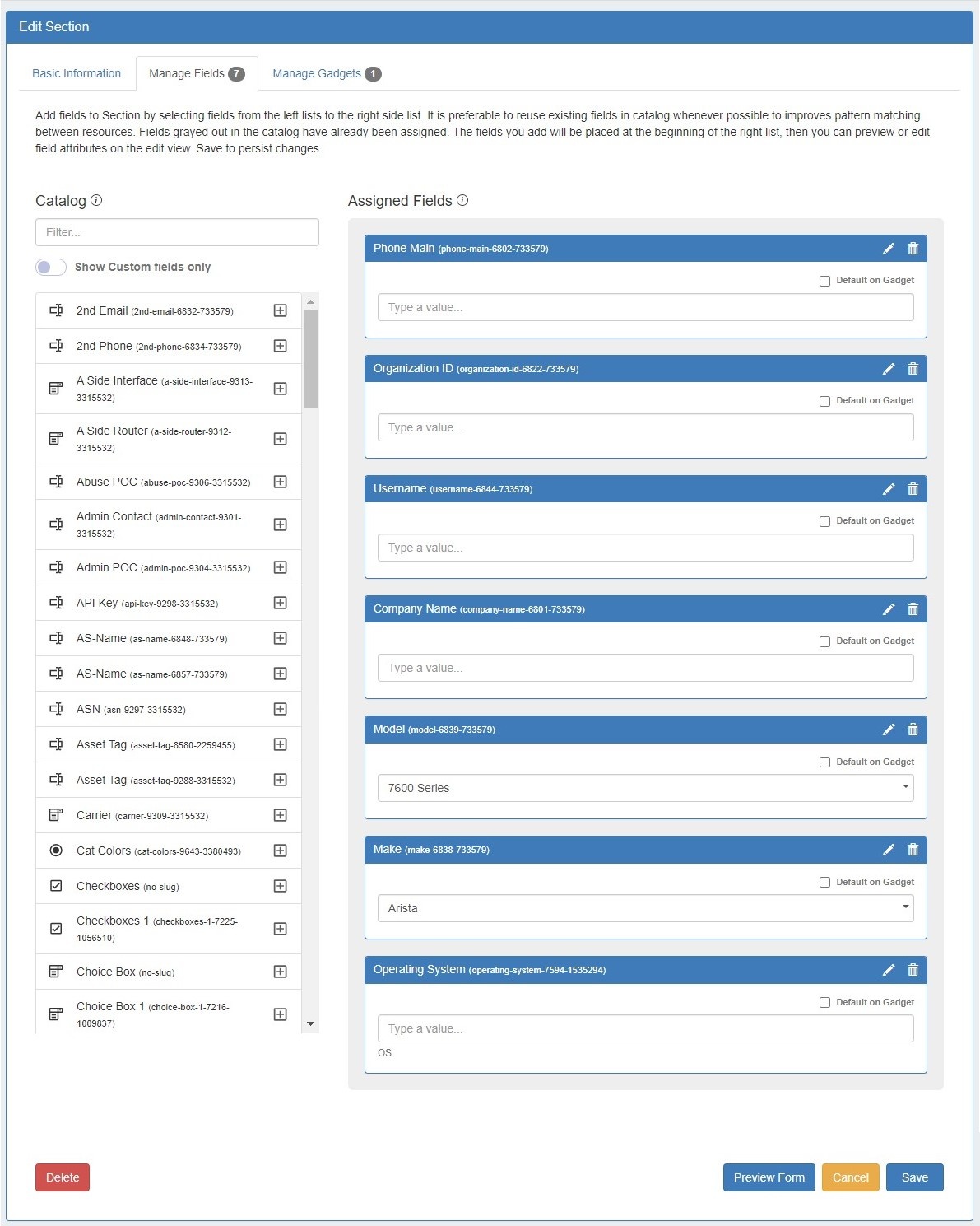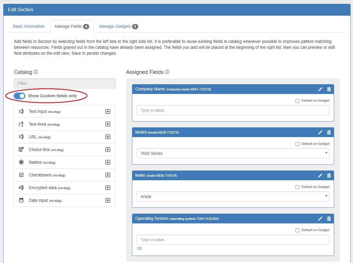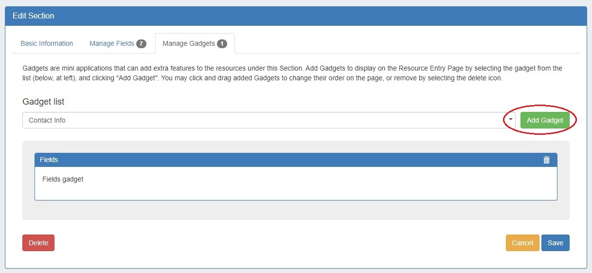 Edit Section has been reorganized into three tabs: "Basic Information", to perform quick edits to the section name or category, "Manage Fields" to update or assign fields to the section, and "Manage Gadgets" to add, edit, relocate, or remove gadgets associated with the section.