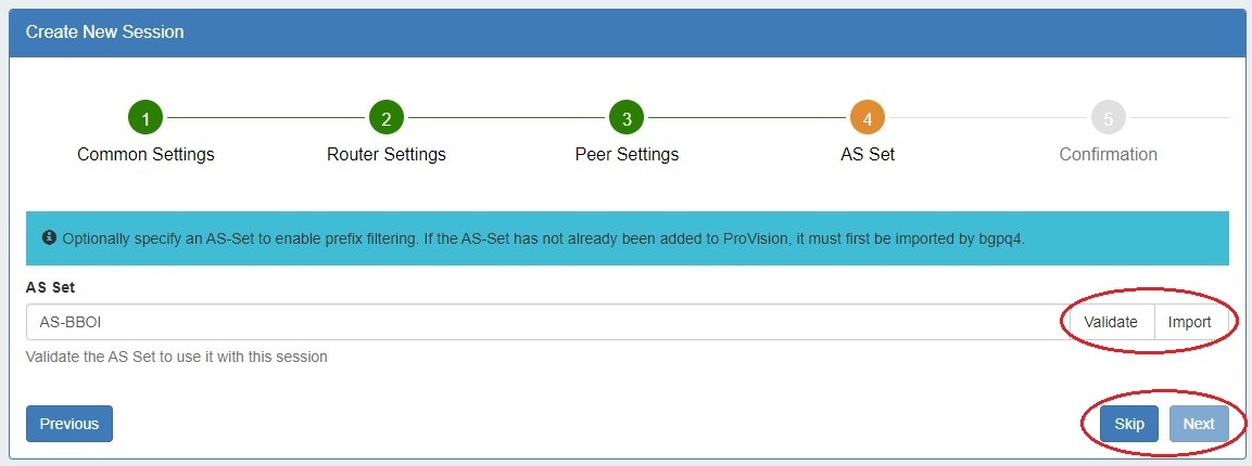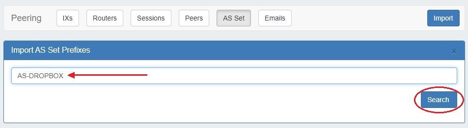 To Import an AS Set click the "Import" button at upper right of the Peering section AS Set subtab. Enter a prefix and click "Search".