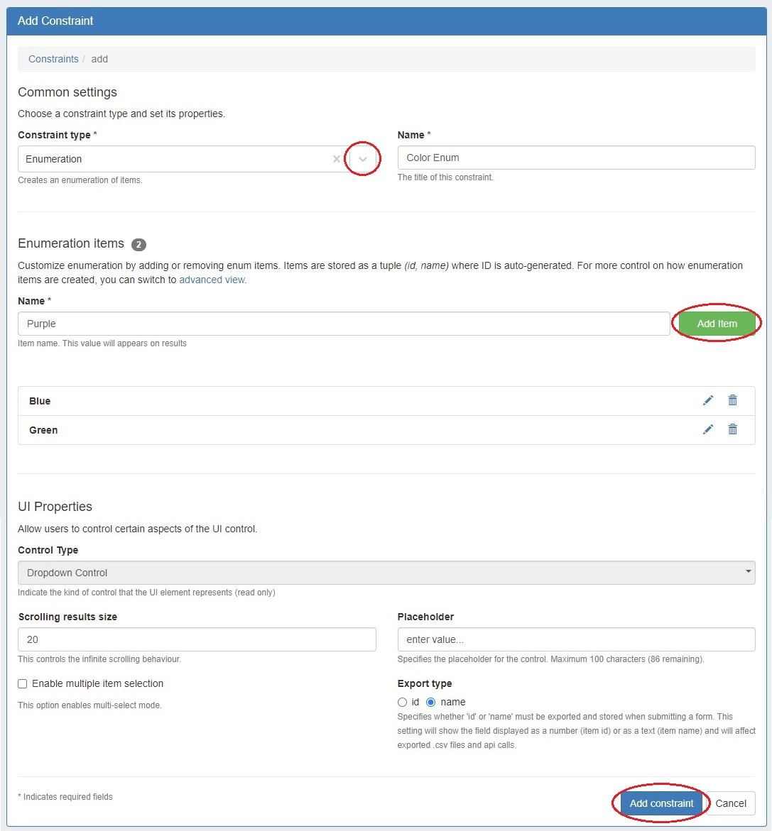 Select a constraint type (here Enumeration) from the dropdown. Each type of constraint will have different values to complete.