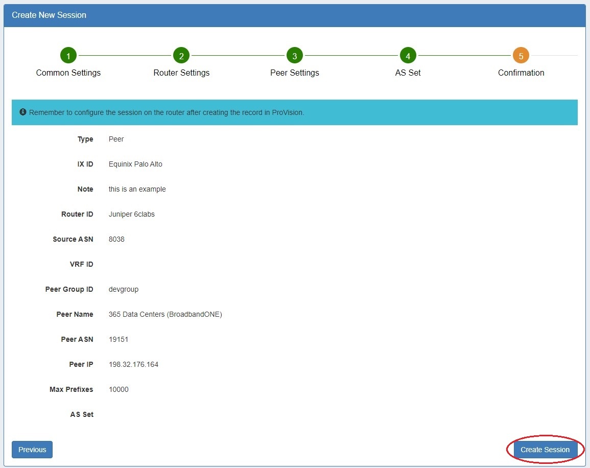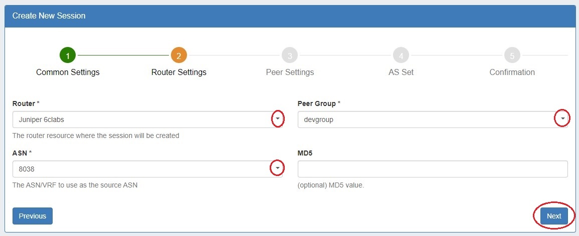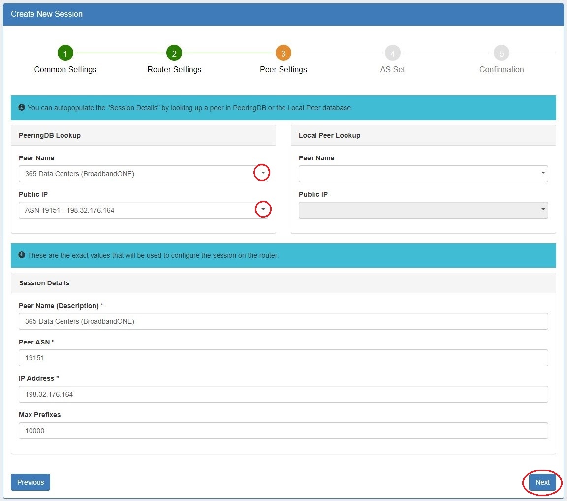 The Peering Add Session form has been updated to a five step wizard format.