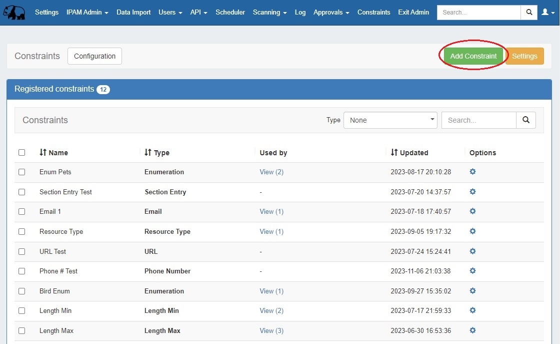 When finished, click "Add Constraint" at the bottom. The constraint will be added to the Constraints List and available from the Admin Edit IPAM Columns page and Resources Edit Section pages to apply to a column or field.