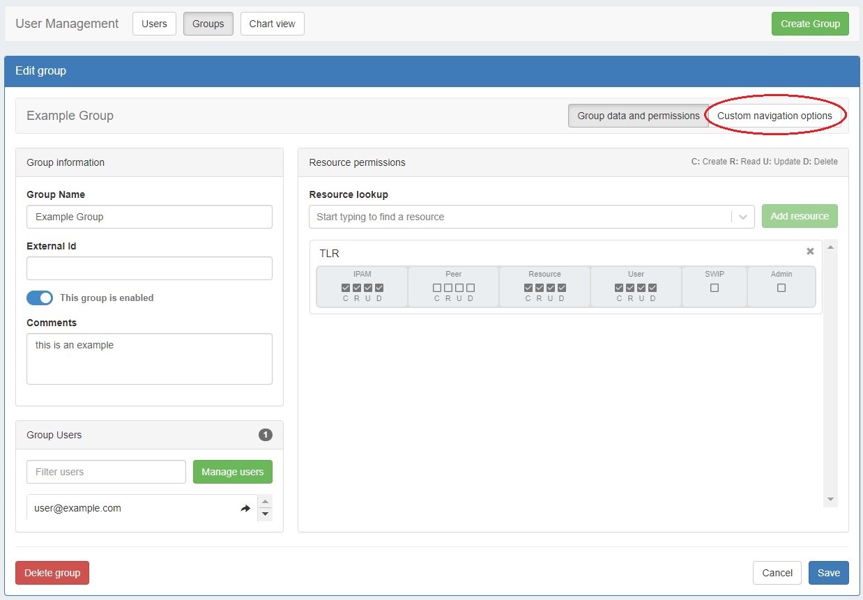 Enable the custom navigation selector and a menu of navigation links will appear. Use the eye icons to hide links from view of users in the group. For example, this group has no Peering permissions (as seen in the above image). Via custom navigation options you can simply hide the entire Peering tab from view for this group of users.