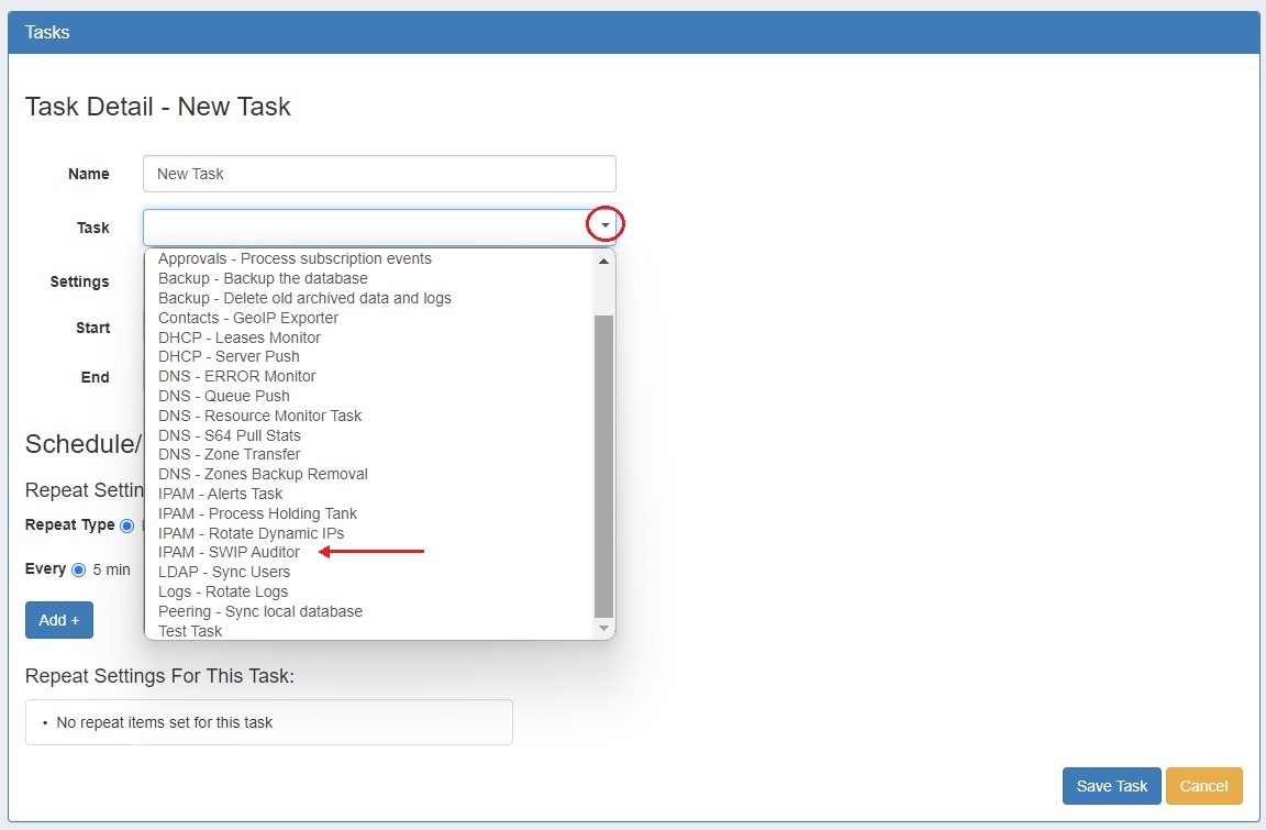 The Scheduler task is available in the Add New Task dropdown.