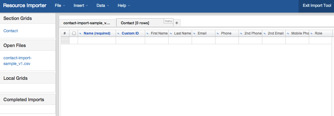 When the Section Grid has been created, required fields will show in blue font with (required) after the header, in this case, "Name" is a required field. The "Custom ID" field is metadata allowing for a unique ID to be associated with each entry, but is not necessary for a successful import. The remainder of the headers directly match the Section's fields.
