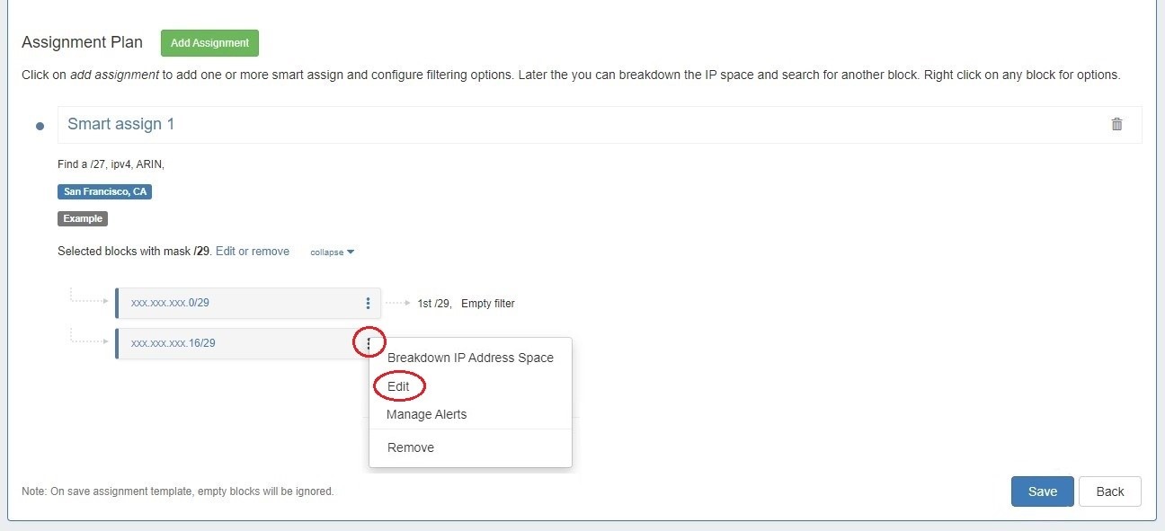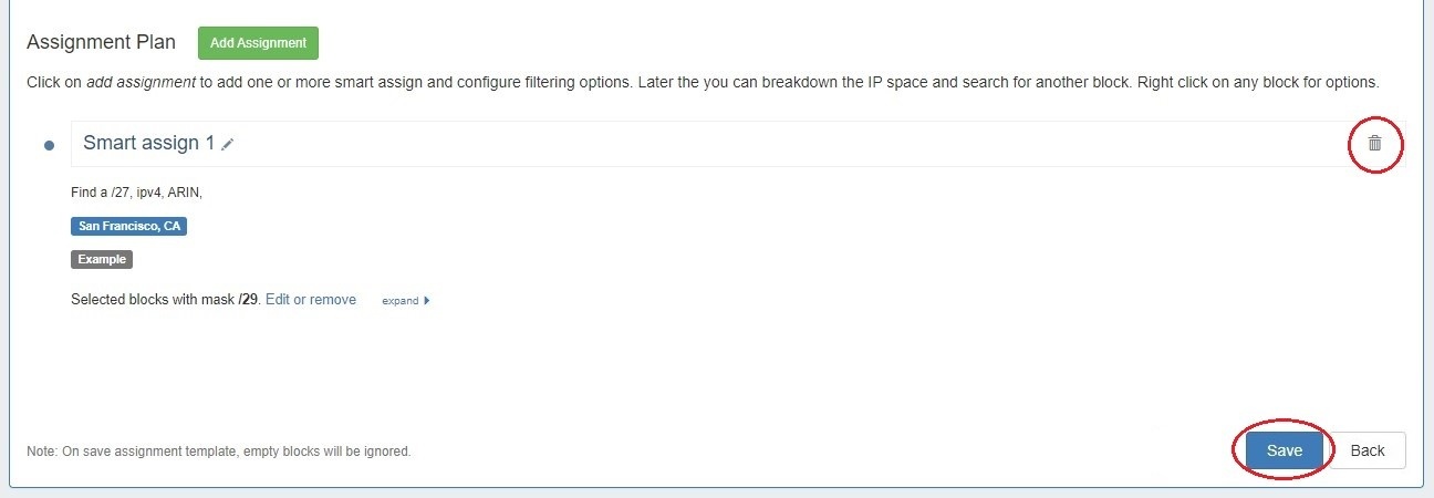 Click on a block CIDR to select that position for assignment, or you may select all. A block may be deselected by clicking the delete icon. Click "Accept" when done.