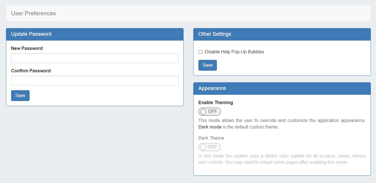 The User Preferences page allows the logged in user to reset their password as well as adjust per-user settings and themes.