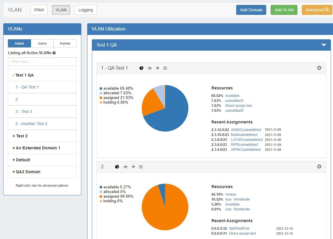 After assigning a block to the VLAN by any method, that block will immediately display in VLAN Manage for that VLAN, in the VLAN's Quickview panel, and the VLAN Utilization display panel will be updated to include the new block.