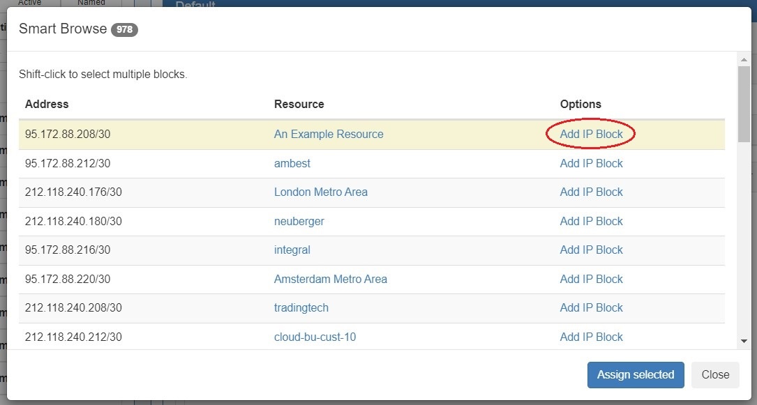 You may assign individual blocks immediately ("Add IP Block"), or select multiple blocks and delay assignment until after your final selections are complete ("Assign Selected").