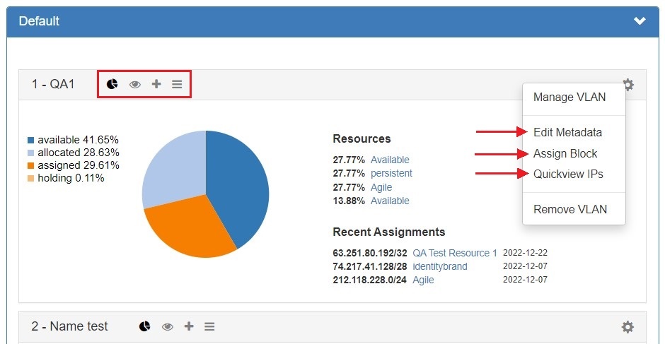 The four VLAN panels (Utilization, Quickview, Assign Block, Edit VLAN Metadata) may be open or closed by clicking on each respective icon in the header bar. Additionally, you may open any non-default panel by going to gear icon and selecting the action option from the menu. These panels are also available in VLAN Manage.