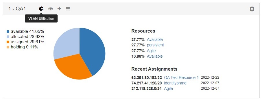 The Utilization panel displays breakdowns for all blocks assigned to the VLAN by both status (available, allocated, assigned, holding) and by resource. Recently assigned blocks are noted under the "Recent Assignments" section, and links are provided to the Resource Entry page for each resource listed. To open or close the Utilization panel, click on the "Pie" icon in the grey header bar.