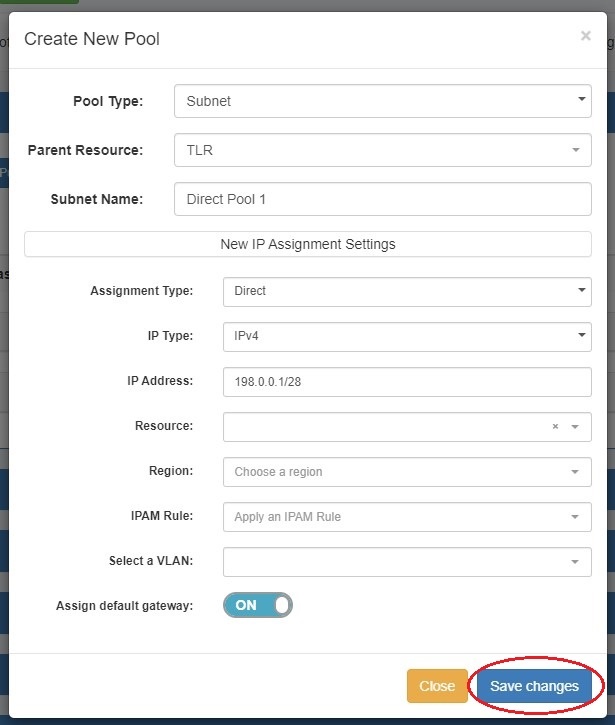 All other fields are optional - Resource, Region, IPAM Rules, and VLAN may be selected to further narrow the block criteria, if duplicate blocks exist. If desired, toggle "Assign Default Gateway" on.