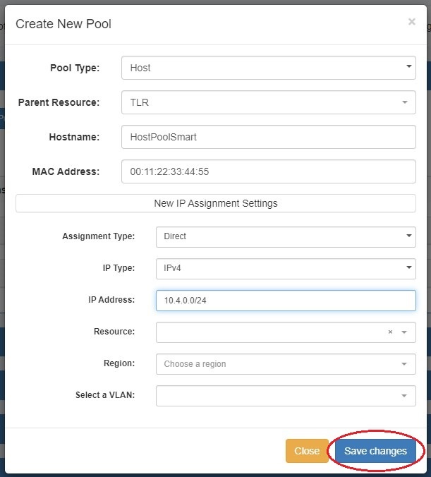 To add a new host pool to a DHCP group, select "Host" as the pool type. Select the parent resource, and add a hostname and MAC address.