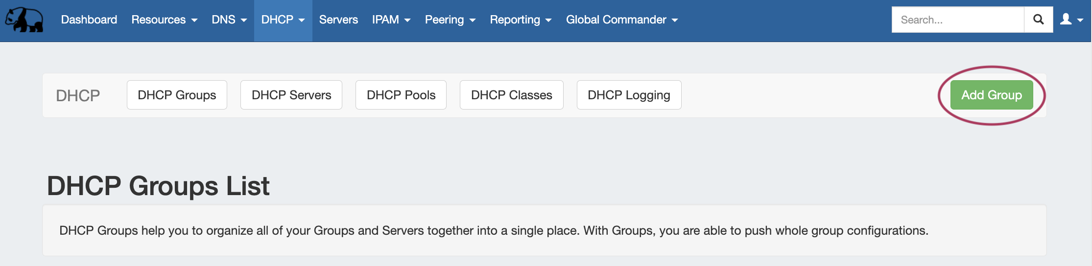 To create a new group, from the DHCP Tab, select the DHCP Groups sub menu. Then, click the "Add Group" button at the top right of the page.