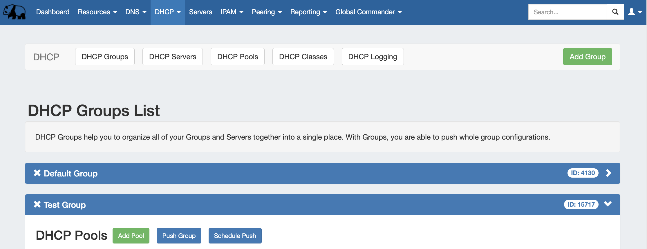 DHCP groups allow for organizing multiple pools together and linking those pools with one or more servers. Pools may be pushed individually, as a group, or at the server level.