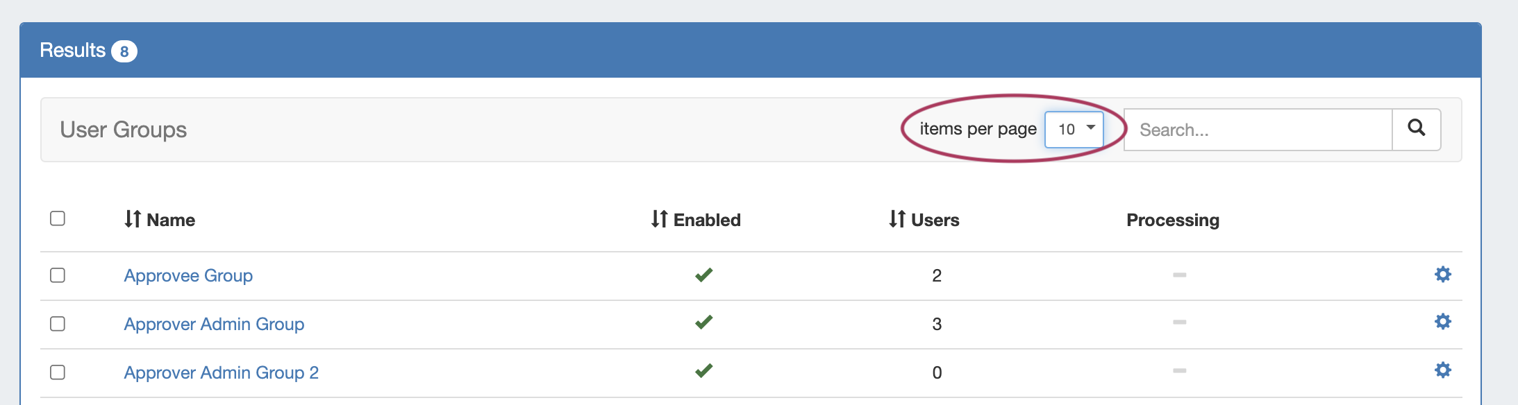 Select the "items per page" filter to limit the number of groups displayed at one time. Any additional users will be displayed on following pages.