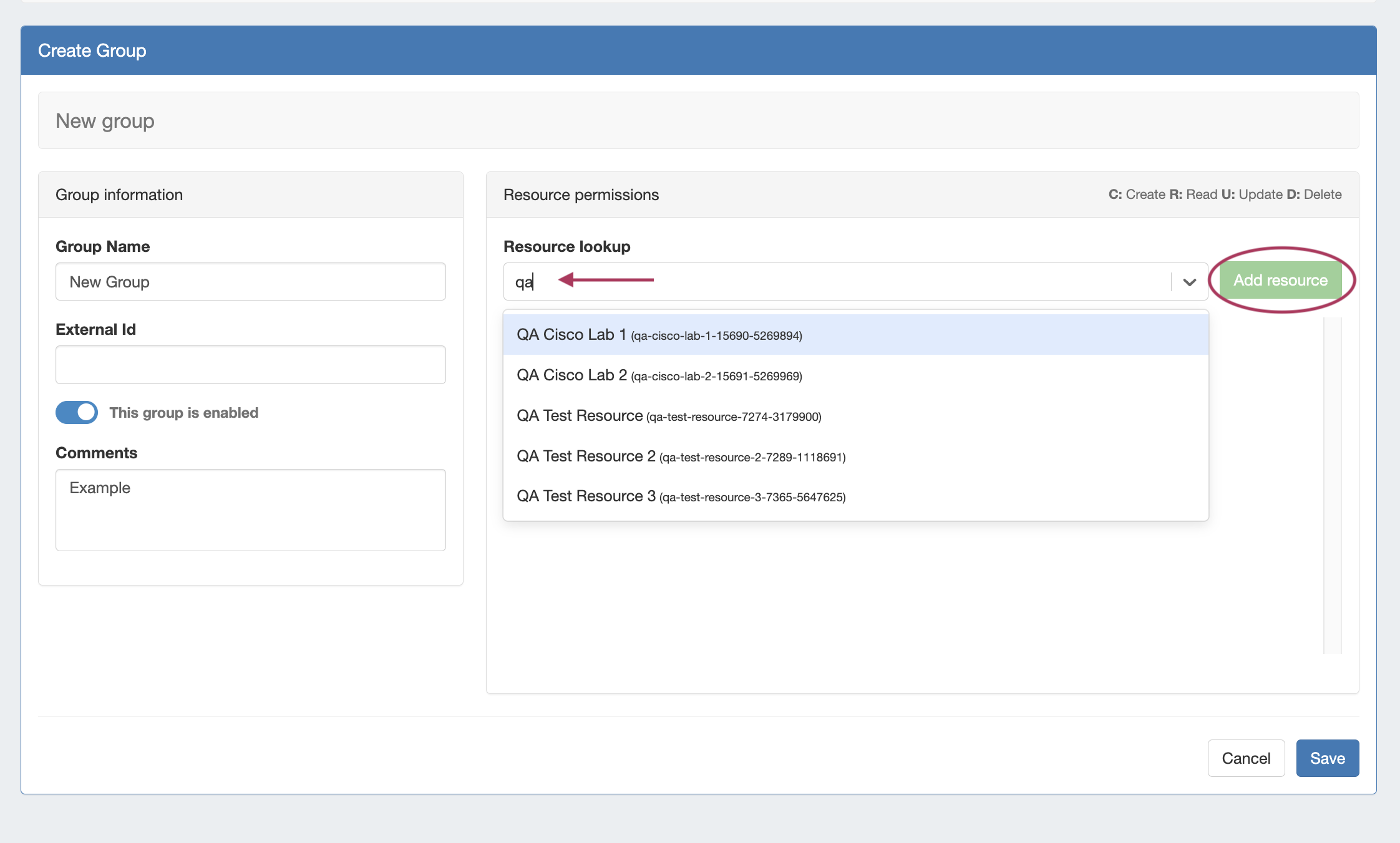 Set the permissions for that group by selecting the resource(s) from the Resource lookup dropdown menu, and clicking the "Add resource" button.