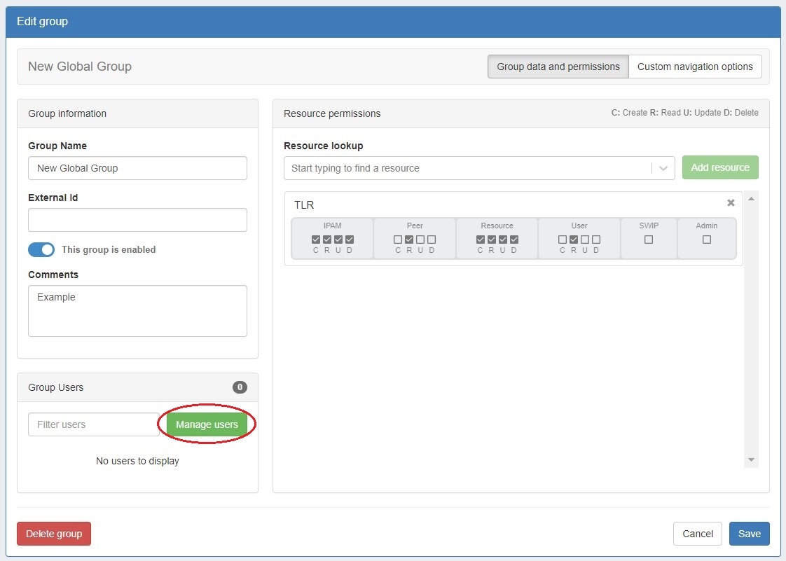 This will bring up the Edit Group screen. From here you can edit the group name or comment, add or remove users from a group, or change resource permissions for the group.