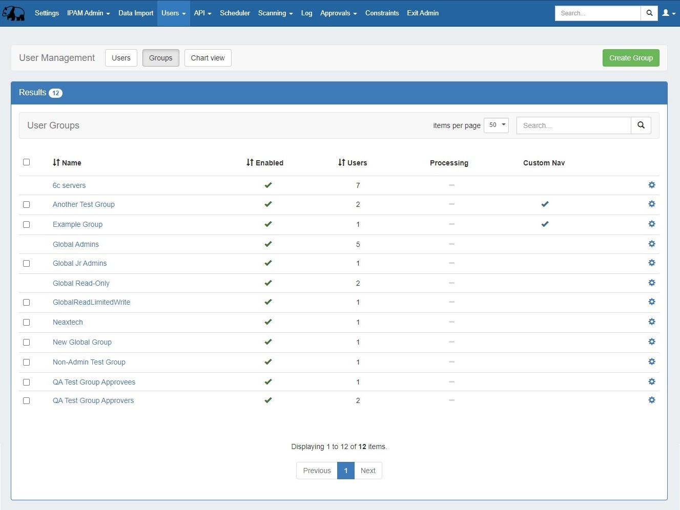 New groups can be created by administrators by clicking the green "Create Group" button at the upper right of the Groups page.