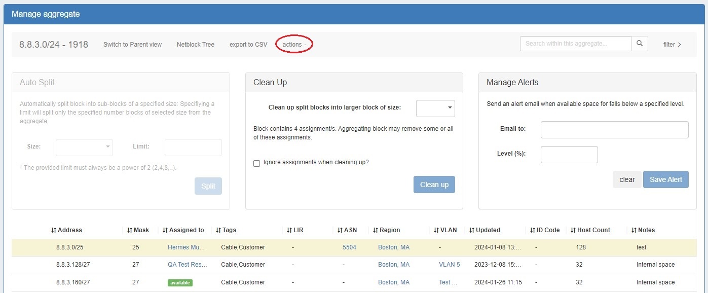 From IPAM Manage, you can perform the aggregate template actions of Auto-Split / Clean-Up, Set IPAM Alert information, export the block list, as well as manage individual blocks.