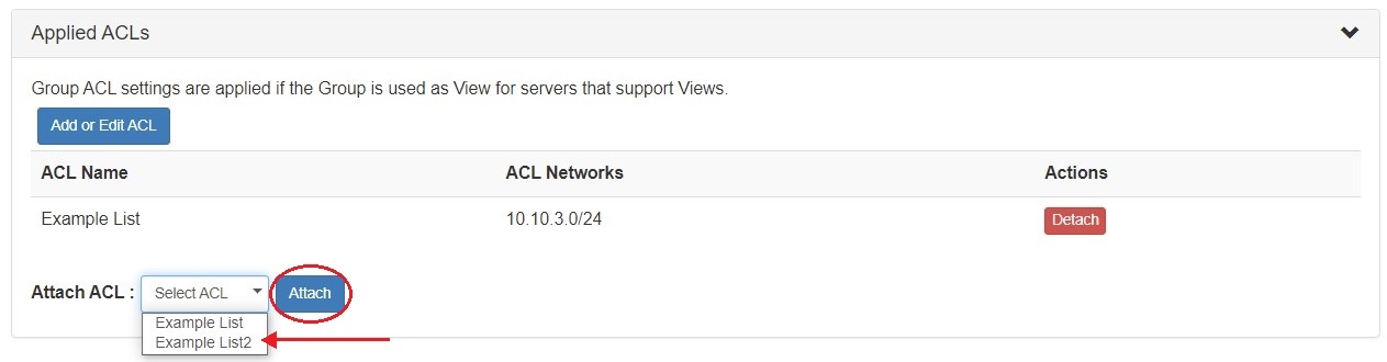 To select a previously created ACL, select it from the "Attach ACL" dropdown and click "Attach".