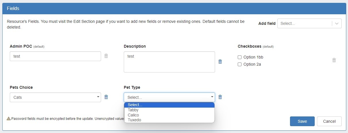 Once the fields are added to the section, they will be available to add to the Field Gadget for any resource of that section, from the Field Gadget's "Add New Field" dropdown.