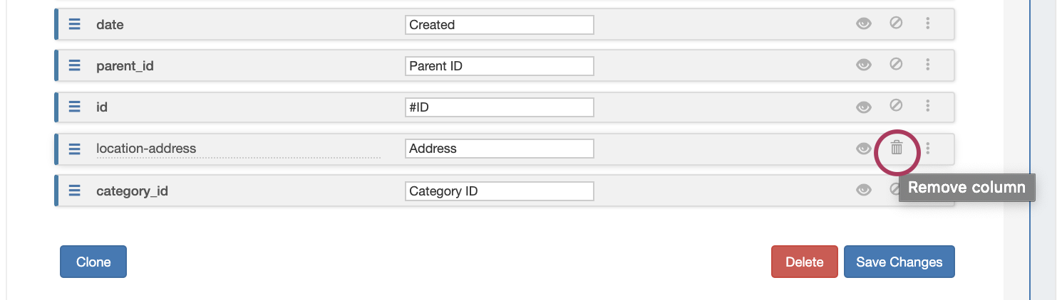 To toggle column visibility on or off, click the "eye" icon on right side of the field row.