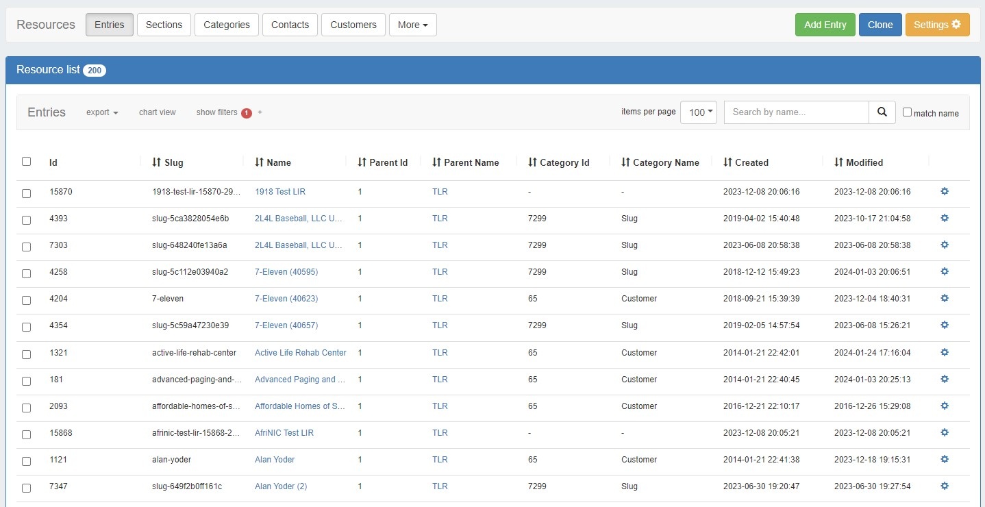 - Entries: Displays resource entries. Applied filter: Resource Type = Entry
