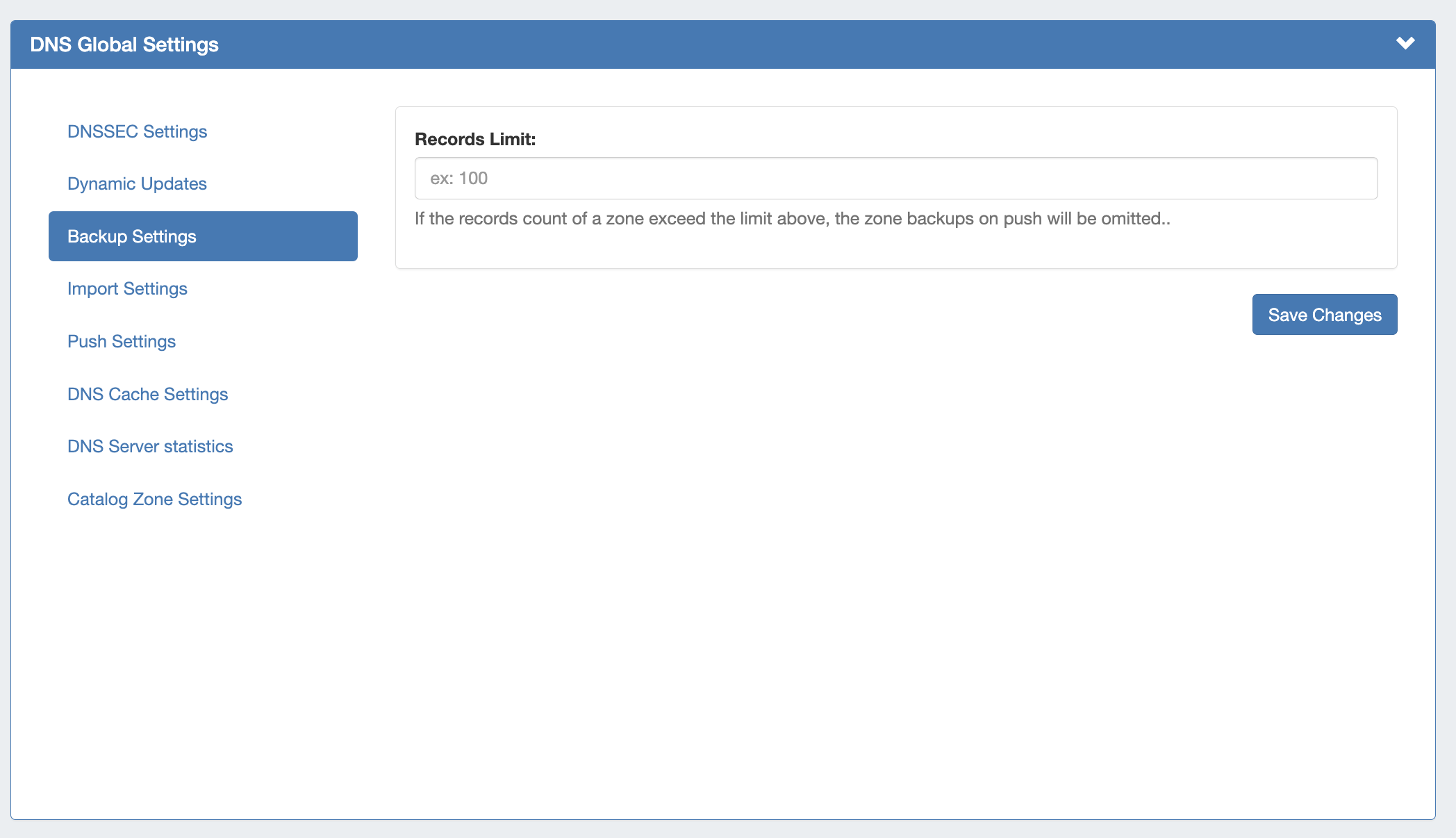 - Records Limit : The limit for the number of records a zone may have for a zone to process a backup. If the records count exceed this number, zone backups will be omitted at zone push.