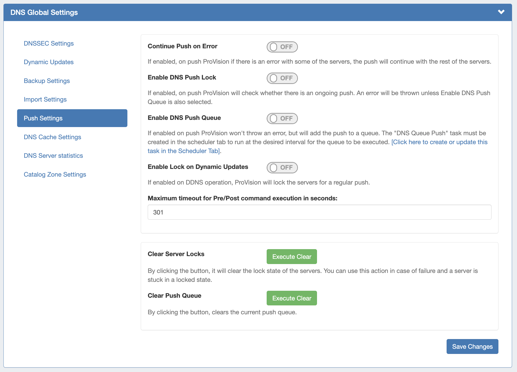 - Enable DNS Push Lock: If enabled, on push ProVision will check whether there is an ongoing push. An error will be thrown unless Enable DNS Push Queue is also selected.