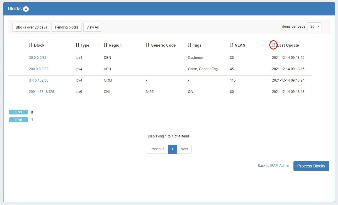 Any block may be viewed in IPAM manage by clicking on the CIDR link for the block, and the list may be sorted into ascending/descending order for any field.