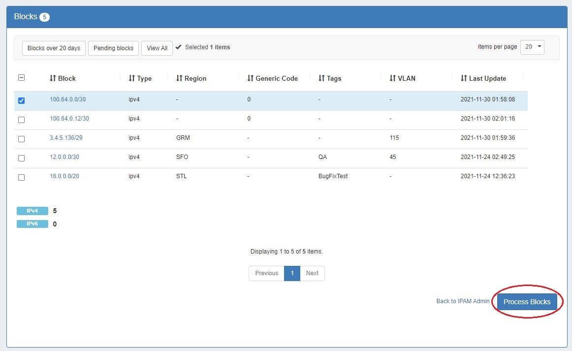 Then, at the top of the holding take, select the desired view from the top of the "Process Holding Tank" page in IPAM Admin. You may choose to view Blocks over X days, View Pending Blocks, or View All.