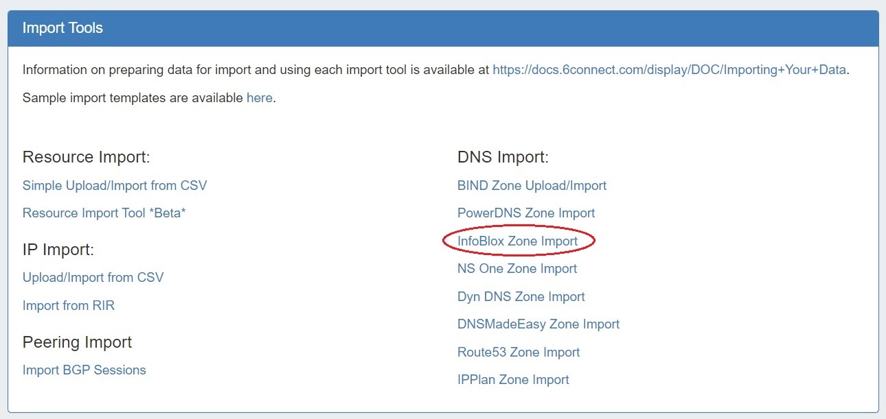 Once server setup has been verified, navigate to the Data Import Tab in the Admin section. Select the "InfoBlox Zone Import" link.