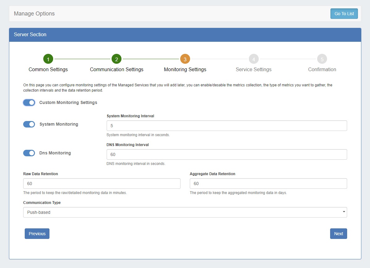 Select the desired monitoring settings for the server. You may either accept the default settings, or click on the toggle for Custom Monitoring Settings to override default settings.