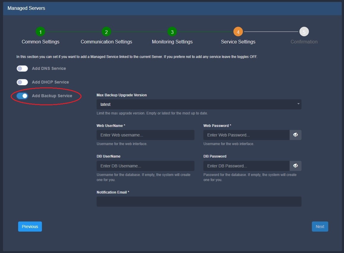 Add Backup Service: Enable / Disable to add a Backup Managed Service link. Options include: