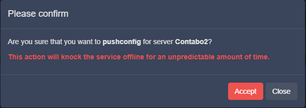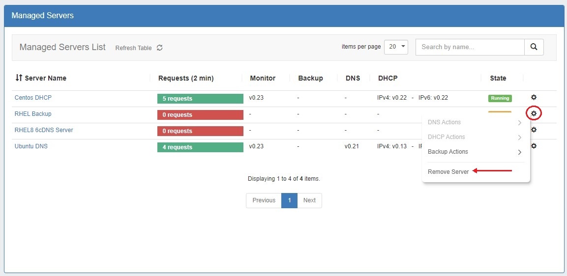 To delete a managed server, right click on the action menu/ row for the server, and select "Remove Server".