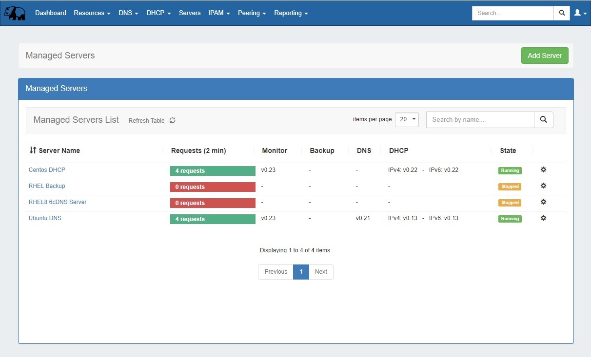 The Managed Server Section List provides server and monitoring data for each managed DNS / DHCP / Backup server.