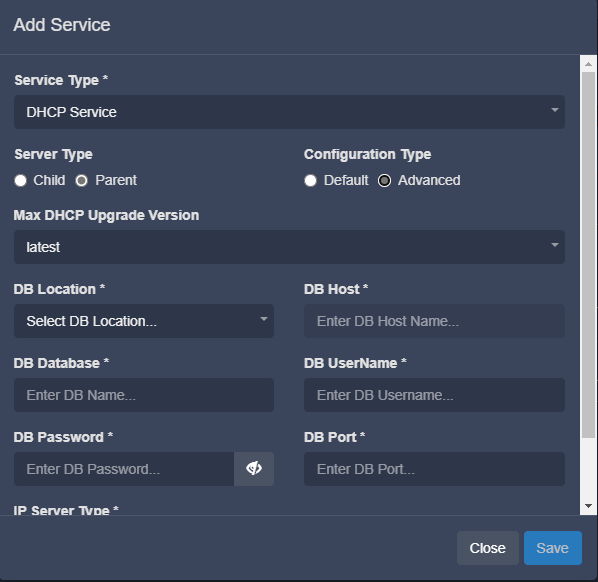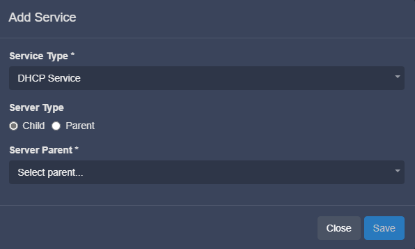 Add DHCP Service: Enable / Disable to add a DNS Managed Service link (Kea / MySQL DB). Multiple DHCP instances can connect to one database, organized as one parent with multiple children.