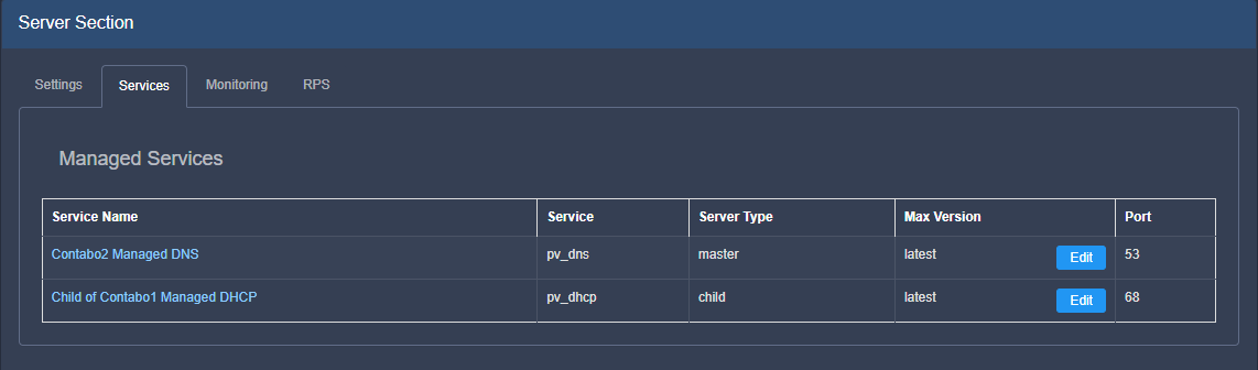 The details of a server are organized into tabs: Settings, Services, Monitoring, and RPS.