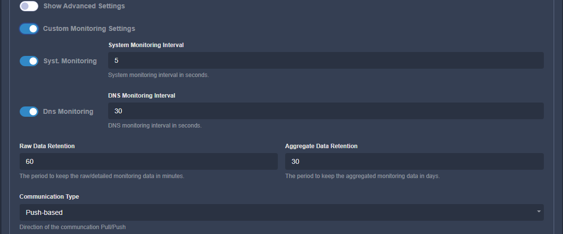 This will be toggled if the user has set custom settings earlier or during the setup. The fields are the same as in the Monitoring Settings step during setup and are described there.
