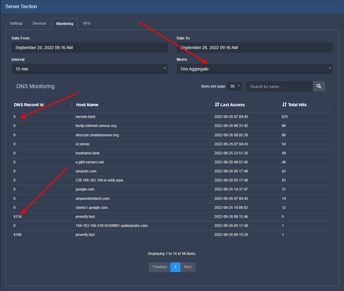 For the DNS records, we aggregate the overall total hits and the last time it was accessed. This is in order to be able to see the most/least used records and the ones which haven't been used for a long time and could be deleted. "Date From" and "Date To" here refer to the "Last Access".