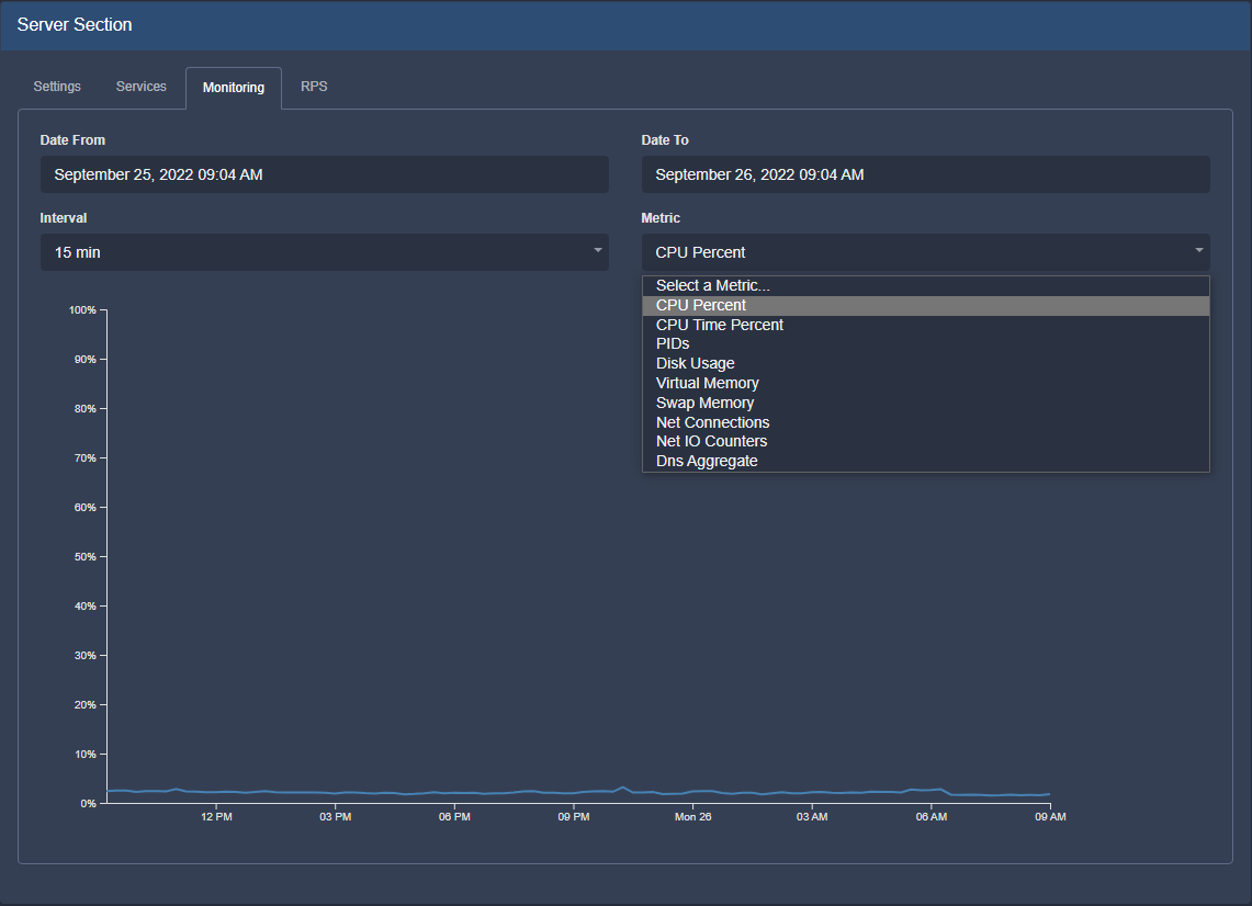 Select a certain time interval (by default, the last 24h) and aggregation interval (5 min, 15 min, 30 min, 1 hour). Note - the charts are different for the different metrics.