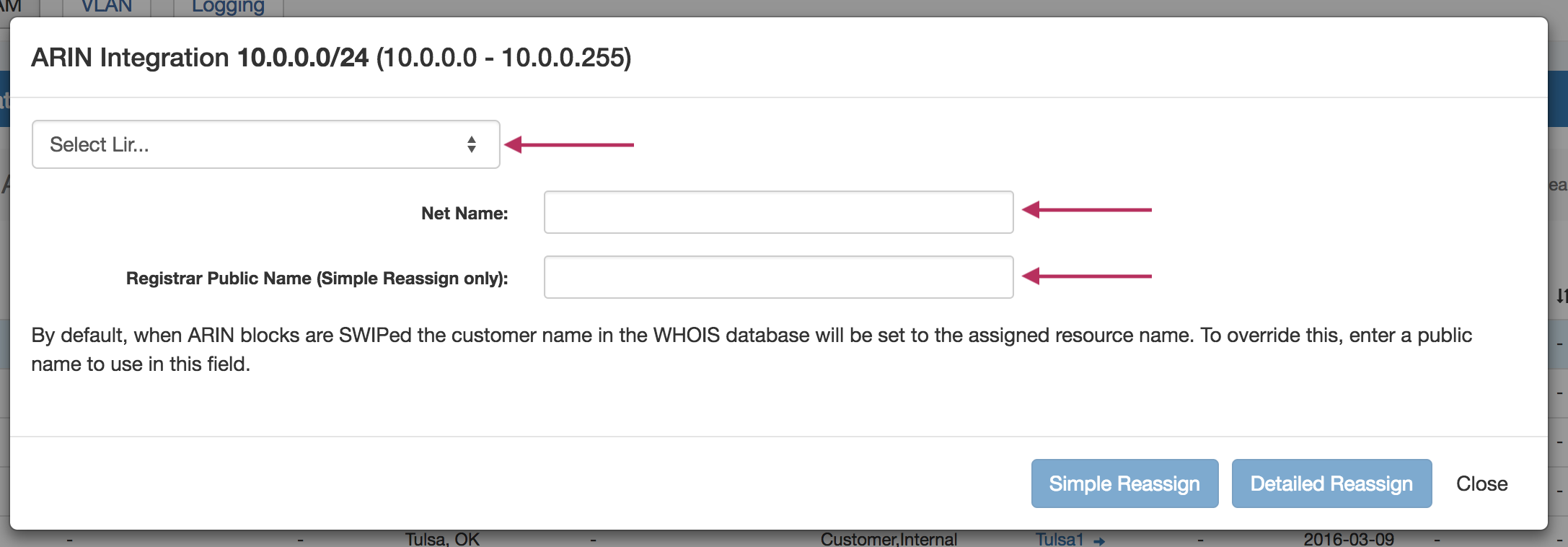 It will bring up an RIR Integration dialog, dependent on the selected RIR (ARIN example shown):