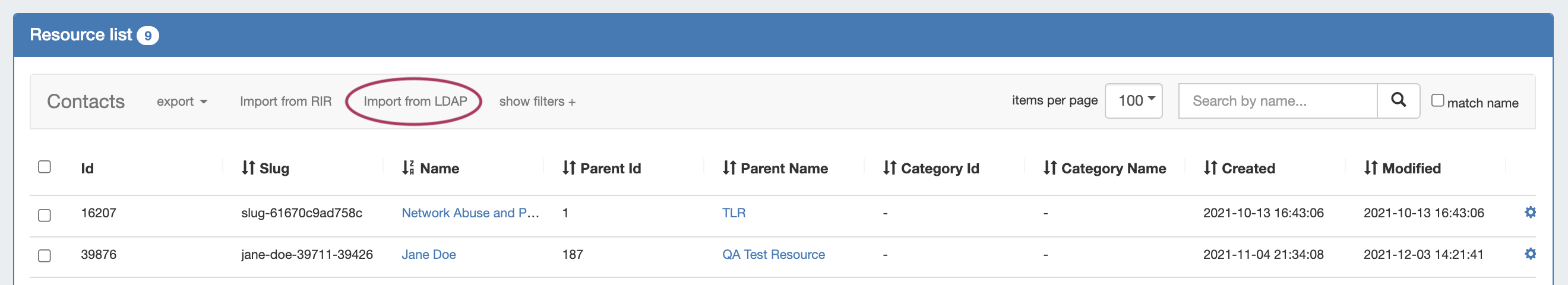 Then, from the Resource Tab → Contacts List, click the "Import from LDAP" button at the top of the list.