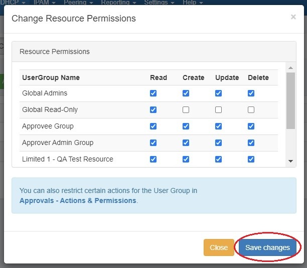 This permissions button allows for direct, point-of-use permissions adjustments to DNS Servers for permission groups. It uses the same CRUD permissions and groups available in the Admin Users tab, but removes the need to remember and search for the DHCP item name.