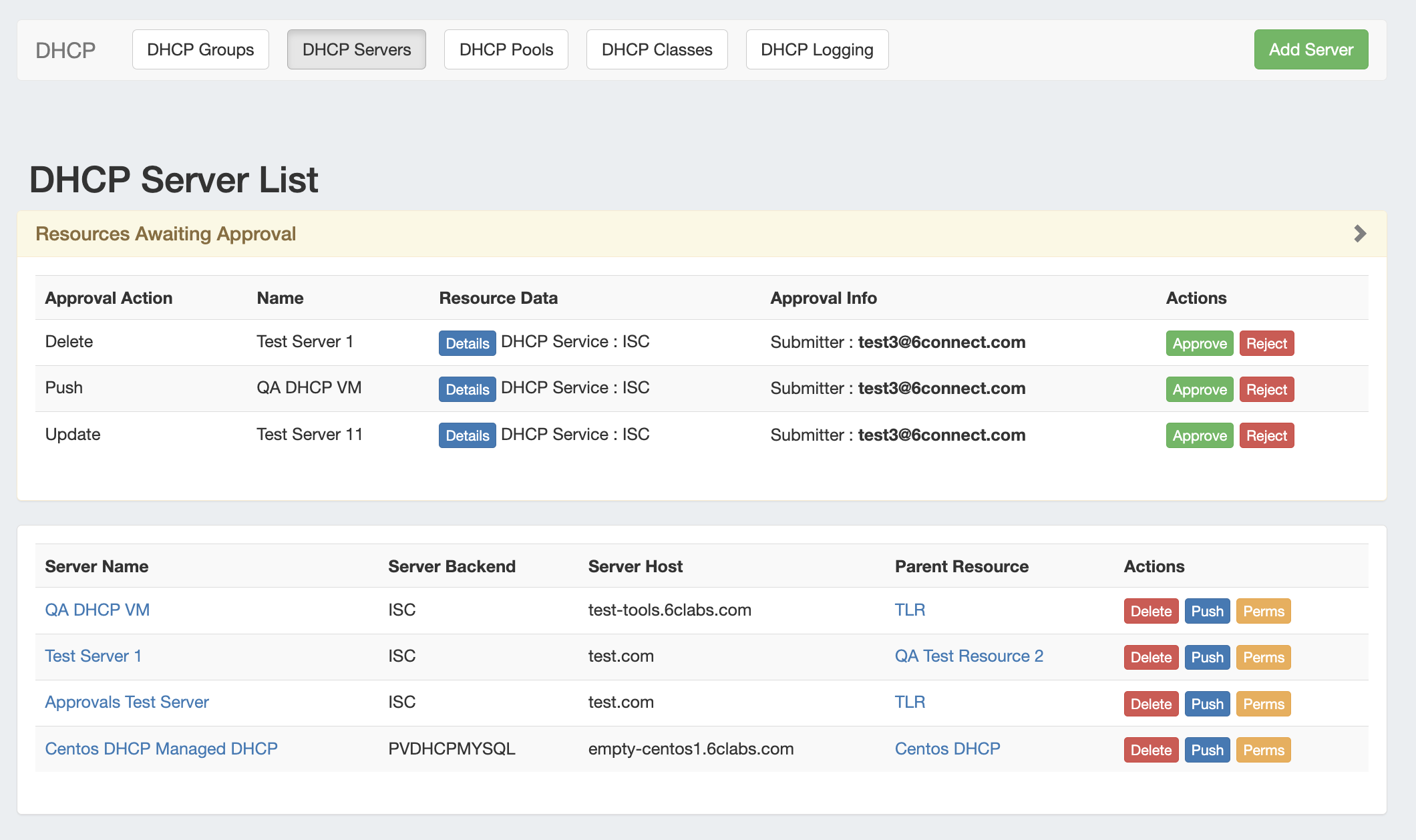 Users with resource "read" permissions may view DHCP Server information, however only those with either Admin permissions or granted group-level server permissions can manage DHCP server creation, edits, and deletion.