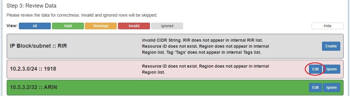 If warnings or invalid entries are found, you may edit the data by clicking the "Edit" button.