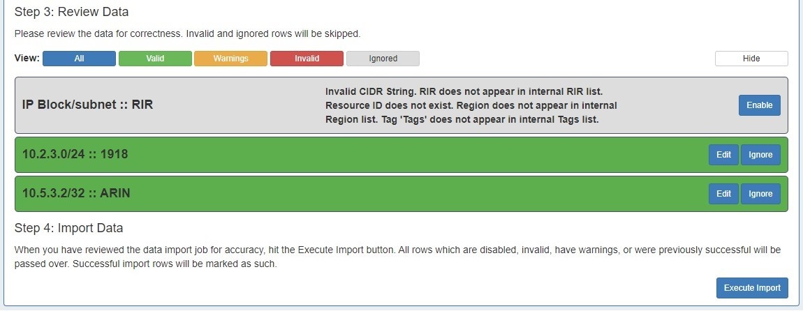 - If the IP Import was only partially successful or requires additional review, you may keep the import job in the "Existing Jobs" list and revise the failed / invalid blocks at a later time. Re-running the import from the same job will allow you to re-attempt import on only the previously unsuccessful / ignored / edited blocks - successfully imported and unchanged blocks will not be affected.